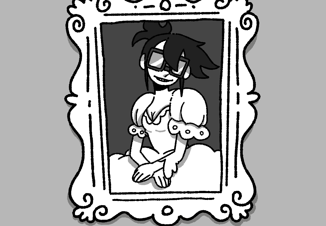 A beautiful young woman with her hair tied back and glasses far too large for her face is depicted in a panel with a fancy frame. Her clothing reflects her wealth, contrasting with her weird smile.